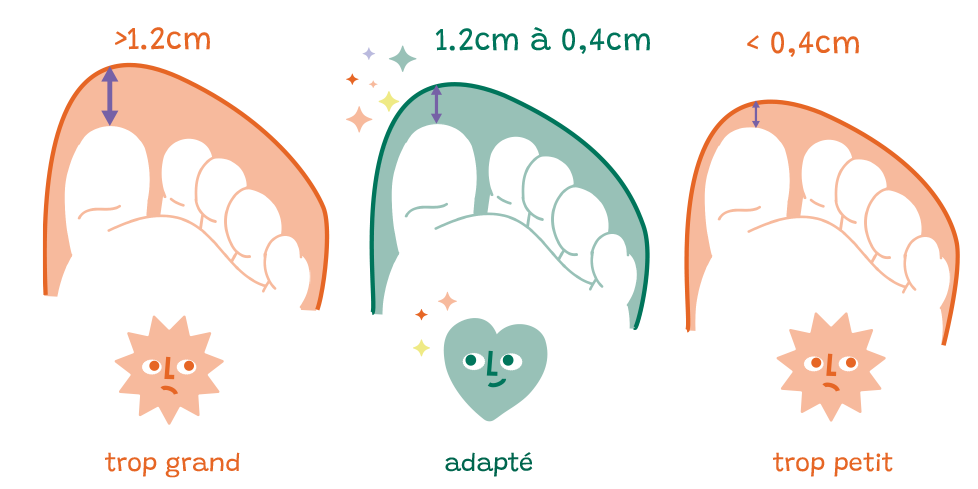 À l’achat, il faut prévoir environ 1 cm d’espace devant les orteils pour permettre au pied de grandir sans être comprimé. On change de paire lorsqu’il ne reste plus que 4 mm de marge. L’idéal est donc de mesurer régulièrement pour s’assurer que l’enfant a encore un peu de place.