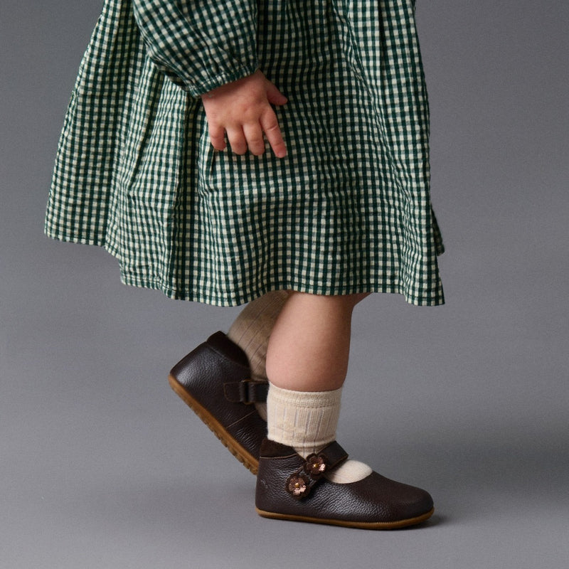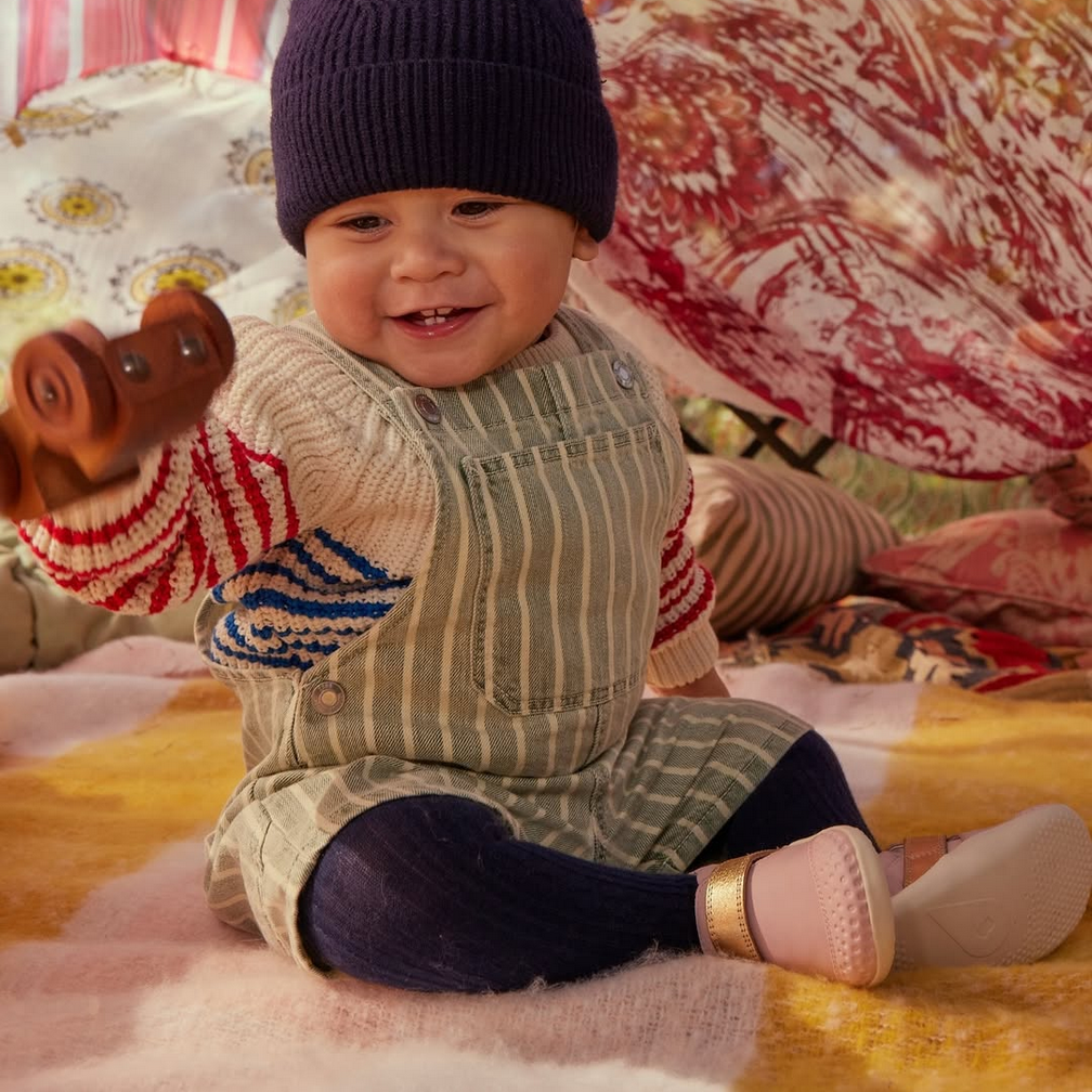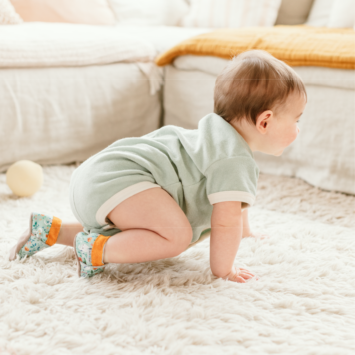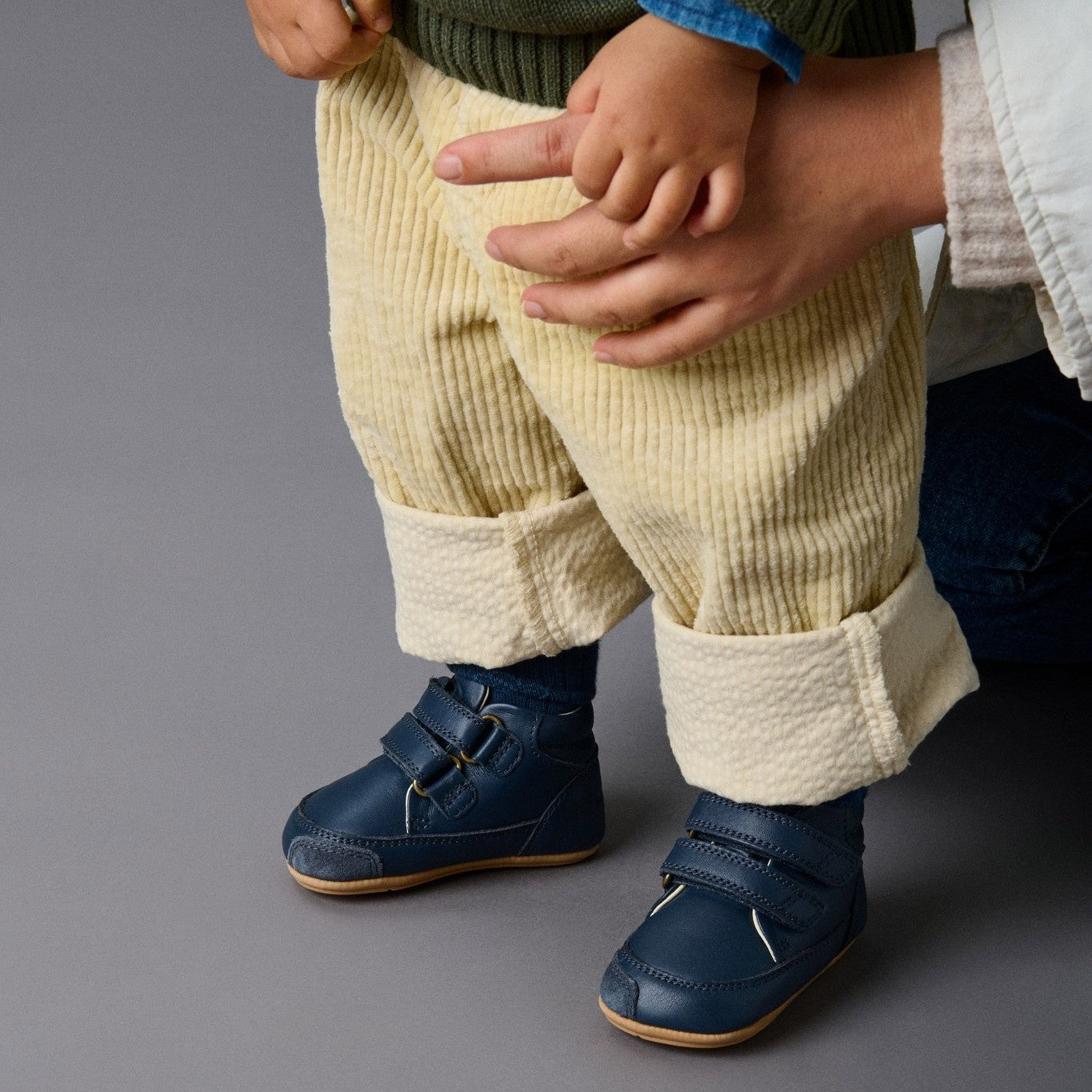 Desde que nace hasta que tu bebé se pone de pie, sus piececitos no necesitan zapatos. Dejar que camine descalzo le ayuda a mantener el equilibrio y a fortalecer sus pies. Para protegerlo del frío o del suelo, basta con unas pantuflas de cuero suave. Se ajustan de forma natural a los pies de tu bebé sin restringir su movimiento.