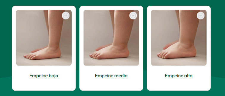 Un empeine es bajo o poco grueso si la altura del pie no es muy significativa y es plano en la parte superior. Un empeine es alto o muy grueso si el volumen en altura es importante, si el pie es muy abultado en la parte delantera o en el medio, o si está marcado por un bultito. Si el pie no es ni muy plano ni muy grueso, entonces es medio o de grosor medio.