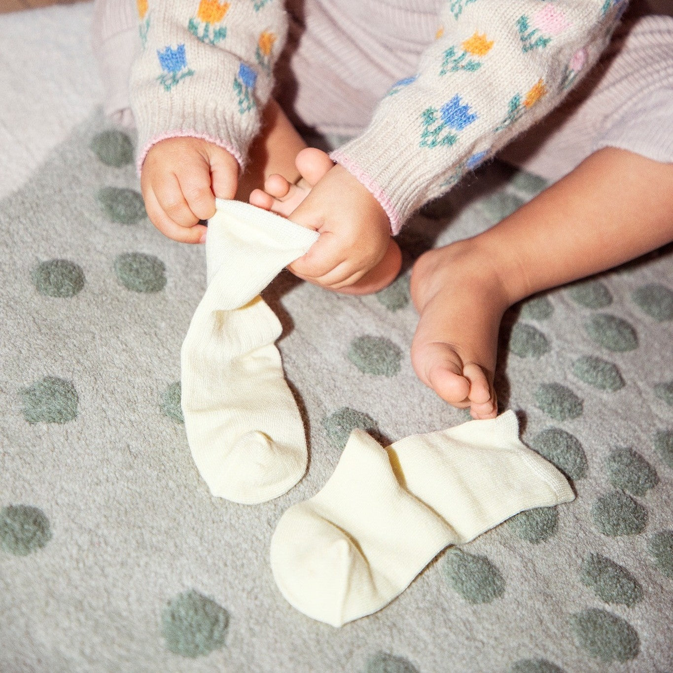 Si votre enfant commence à se lever ou à marcher, pensez aussi aux chaussettes antidérapantes : elles évitent les glissades sur le carrelage ou le parquet, tout en laissant le pied bouger librement.