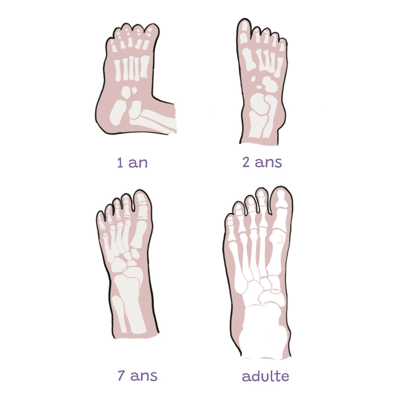Lorsque la motricité de l’enfant évolue, ses pieds s’adaptent (moins de gras, moins de cartilage, plus de muscles, ossification).